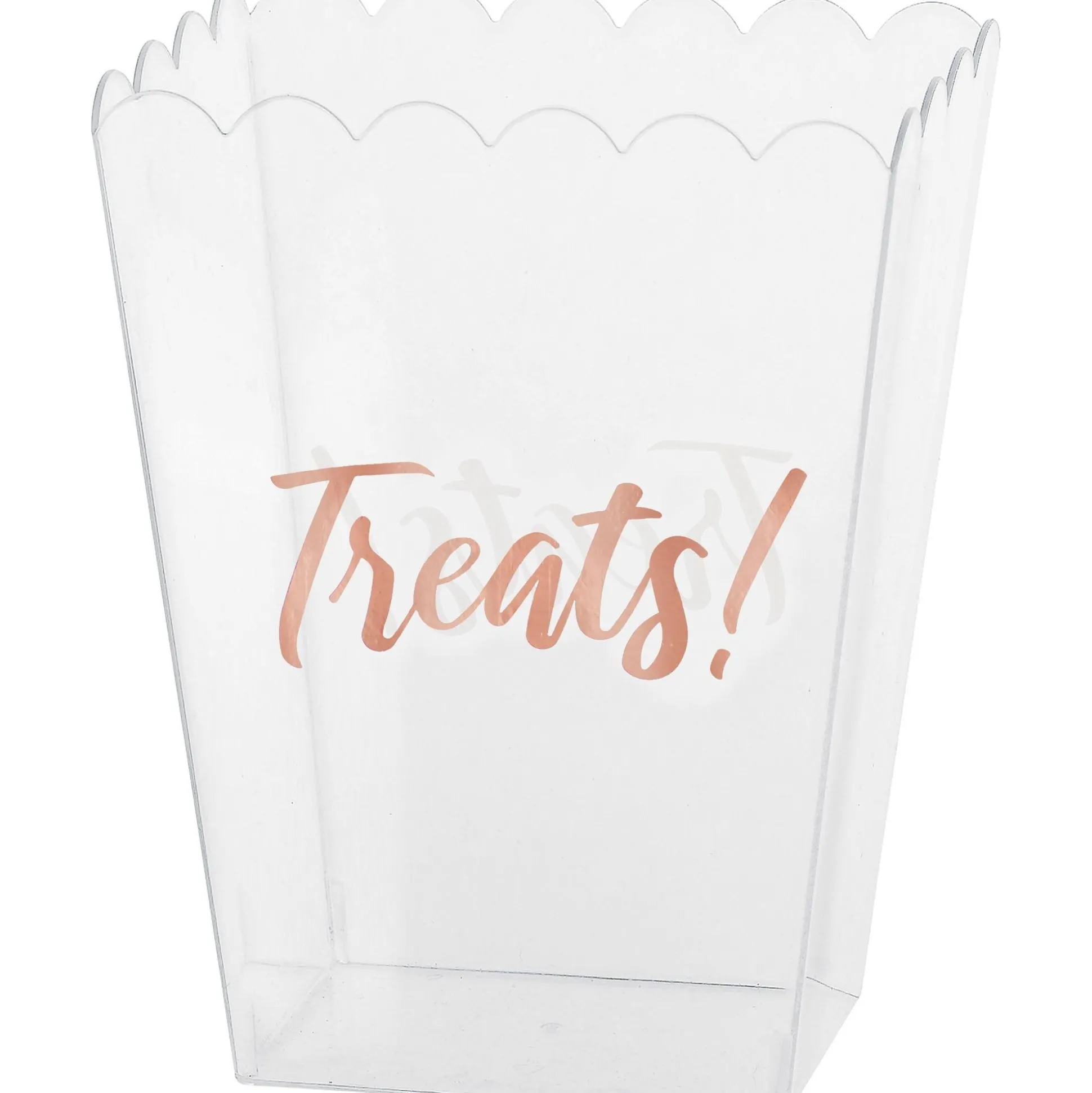 Whether You’Re Planning An Elegant Wedding Reception Or A Fun Holiday Party, A Metallic Rose Gold Treats Plastic Scalloped Container Makes A Stylish Addition To Your Party Table. Perfect For Filling Up With Sweets And Treats To Create A Tantalizing Candy Buffet, This Plastic Candy Container Features Scalloped Edges Along The Top And A Metallic Rose Gold Treats! Headline On The Front. It’s Made Of Transparent Plastic To Let Guests See The Yummy Treats Inside. A Clear Container Is Also A Great Way To Set Out Party Favors, Small Keepsakes, Or Flowers!