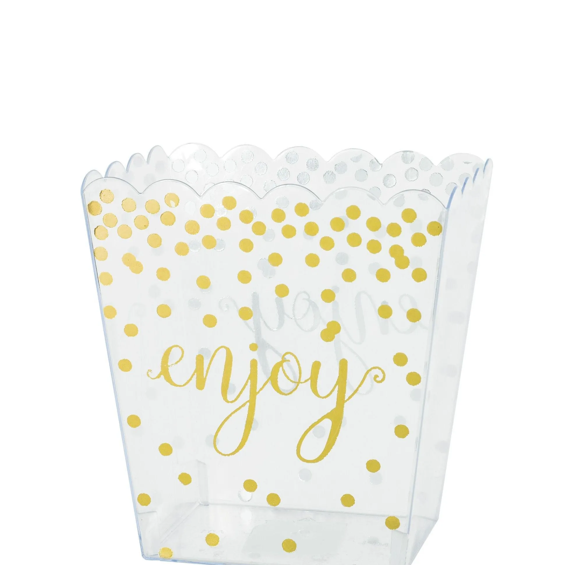 Whether You’Re Planning An Elegant Wedding Reception Or A Fun Holiday Party, A Small Metallic Gold Polka Dots Plastic Scalloped Container Makes A Stylish Addition To Your Party Table. Perfect For Filling Up With Sweets And Treats To Create A Pretty Candy Buffet, This Plastic Candy Container Features Scalloped Edges Along The Top. It’s Made Of Transparent Plastic To Let Guests See The Yummy Treats Inside And Includes A Fun Gold Polka Dot Pattern And An Enjoy Headline. A Clear Container Is Also A Great Way To Set Out Party Favors, Small Keepsakes, Or Flowers!