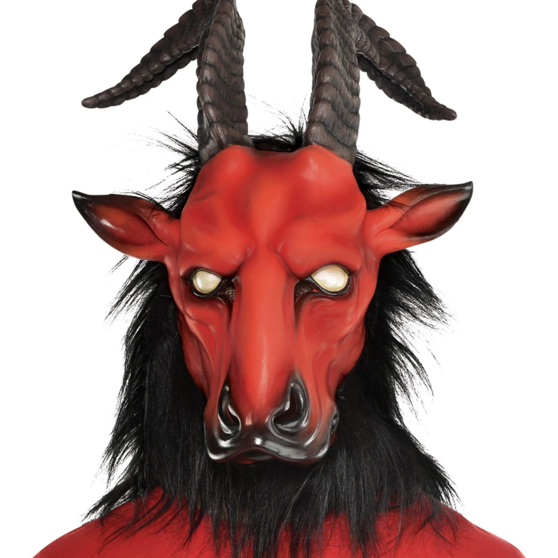 Release The Beast From The Burning Hellfire In This Devilish Mask. The Red Latex Mask Features A Goat Head With Skewed Brown Horns, Blank White Eyes, Pointy Red Ears, And A Long Black Beard.