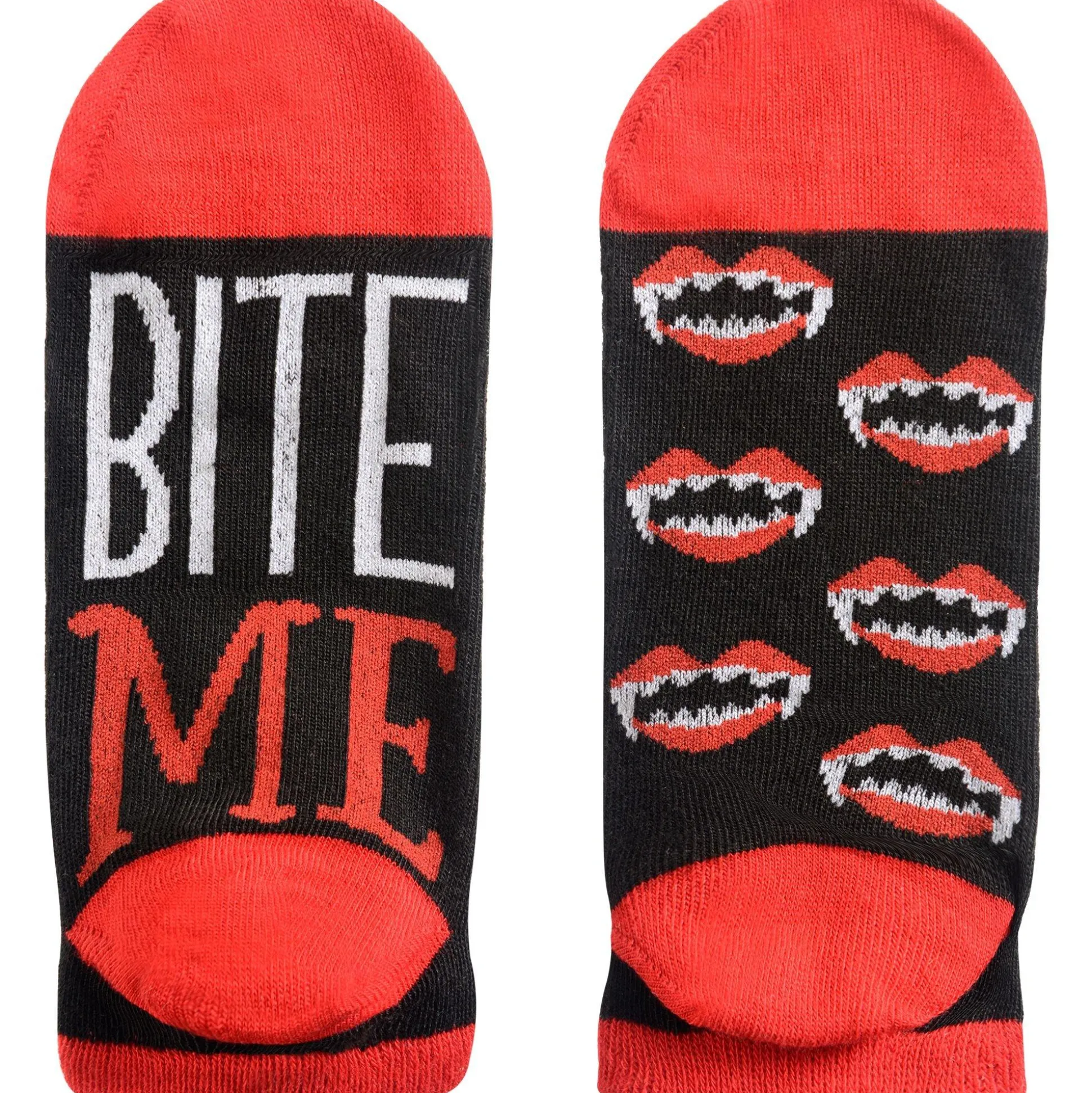 Need Your Space? Send A Clear Message When You’Re Lounging On The Couch In Bite Me No-Show Socks For Adults! These Socks Are Black And Red And Feature The Headline Bite Me On One Sole And Vampire Fangs On The Other. Wear These Socks On Halloween Or Use Them As A Comical Gift!