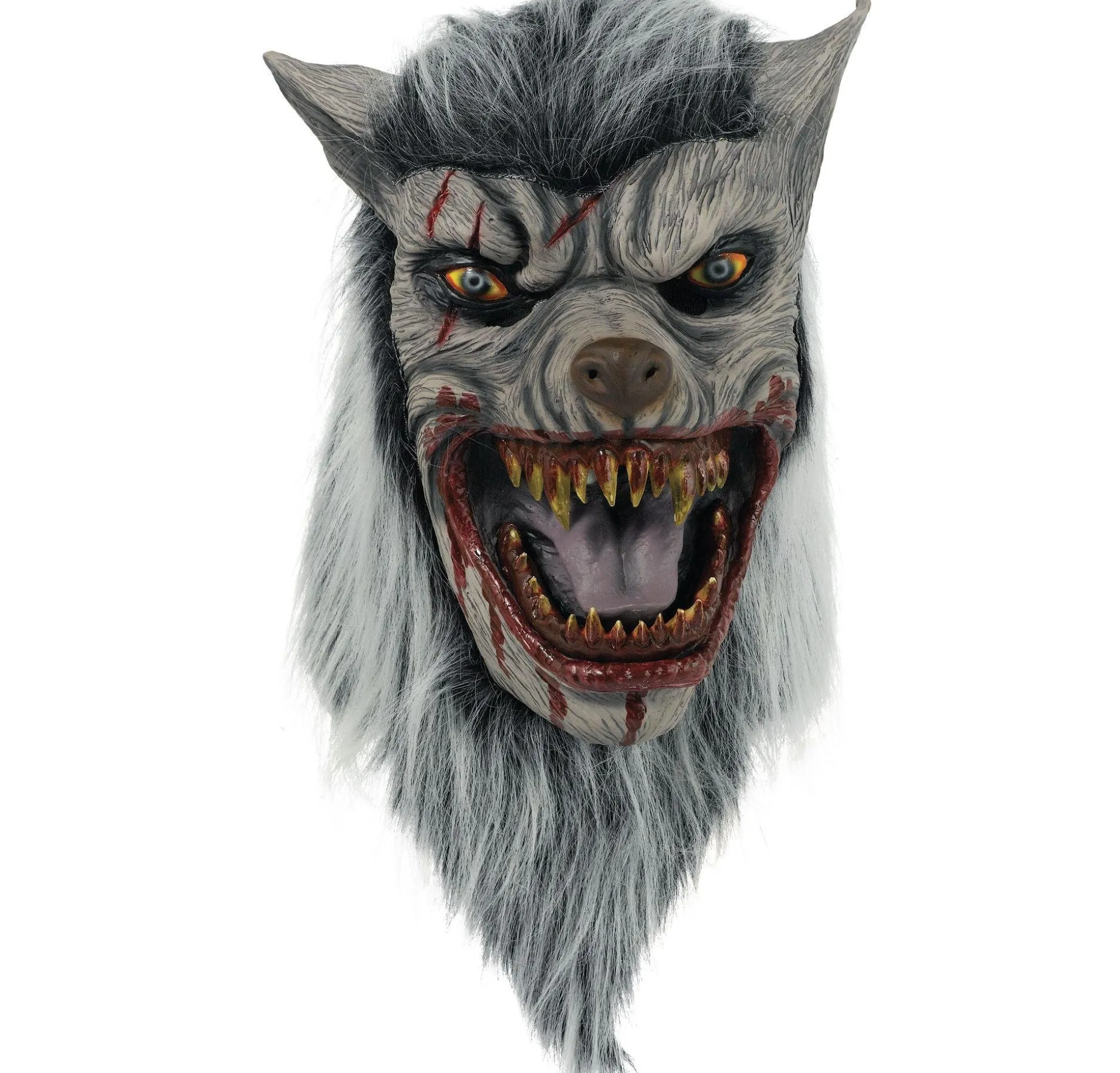 Let The Transformation Begin! This Bloody Werewolf Mask Features Snarling Yellow Teeth, A Blood Spattered Face, And Gray Fur That Goes Down To The Neck. Complete Your Werewolf Costume And Terrorize Your Town On The Next Full Moon With This Furry Werewolf Mask!