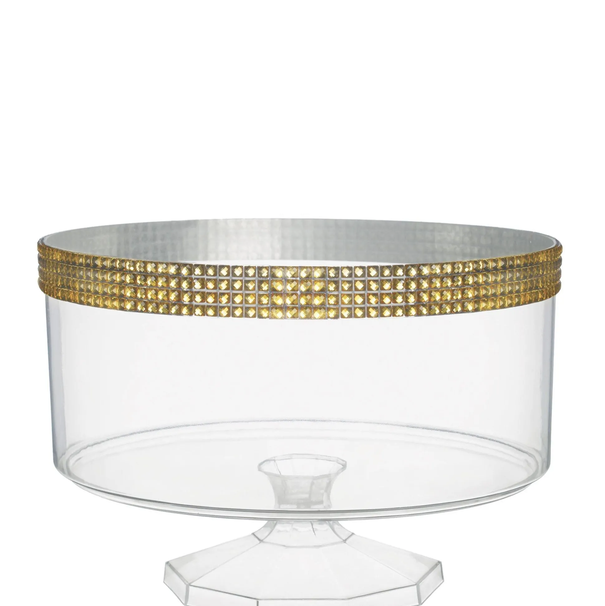 Put Tantalizing Sweet Treats Up On A Pedestal For Your Guests In A Gold Rhinestone Clear Plastic Trifle Container! Featuring A Clear Plastic Cylinder Atop A Faceted Stand That’s Decorated With Gold Rhinestones On The Rim, This Chic Trifle Container Makes An Elegant And Easy-To-Use Addition To Your Candy Buffet Display. Perfect For Baby And Bridal Showers, Weddings, Birthdays, And Any Other Celebration, The Clear Plastic Candy Dish Can Be Filled With Lollipops, Gumballs, Jelly Beans, Or Any Other Tasty Treat You Can Think Of!