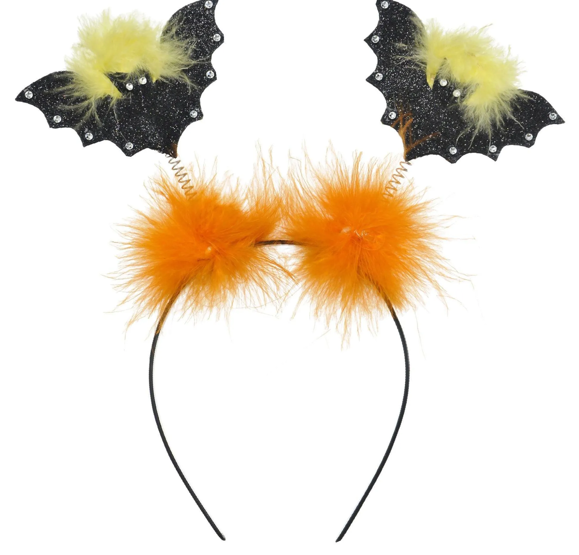 Go Batty With Our Bat Head Bopper! This Festive Halloween Hair Accessory Features A Plastic Headband With Glitter Bats With Rhinestone Detailing That Bobble On Silver Antennae. Yellow Marabou Is Attached To The Bats To Give A Moonlight Effect. The Top Of The Headband Is Trimmed With Orange Marabou. Wear With Your Halloween Costume Or To A Halloween Party!