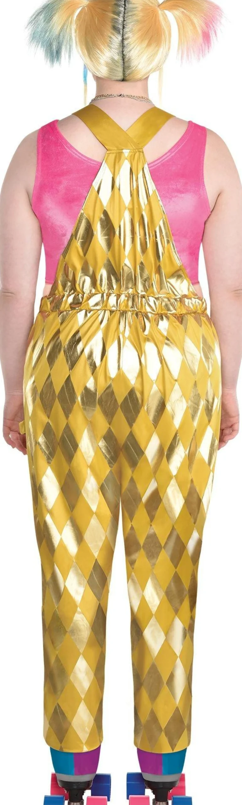 Hey There Puddin’! Find Your Stride As The Colorful Queen Of Mayhem — Harley Quinn. This Plus Size Costume Is Based On Harley’s Beating-Up-Goons Outfit In Birds Of Prey. It Features A Harlequin Pattern Gold Overalls Jumpsuit With Decorative Knee Pads And A Zip Closure. A Fuzzy Pink Polyester Crop Top Competes The Costume.