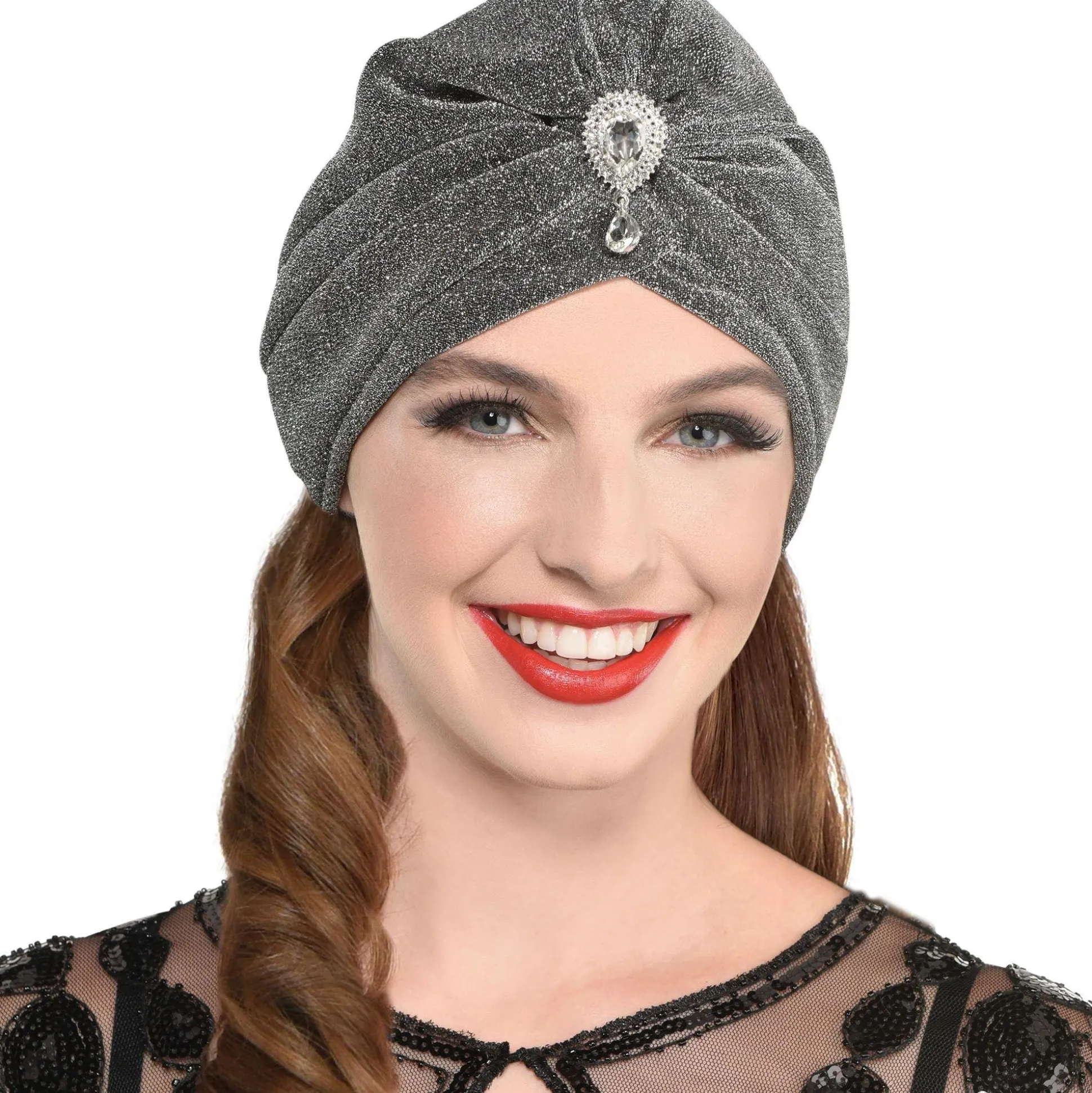 No Doubt You’Ll Shine On The Dancefloor Accessorized In This Fancy Turban. It’s Made Of A Sparkling Gray Fabric And Features A Large Tear-Shaped Gemstone Front And Center.