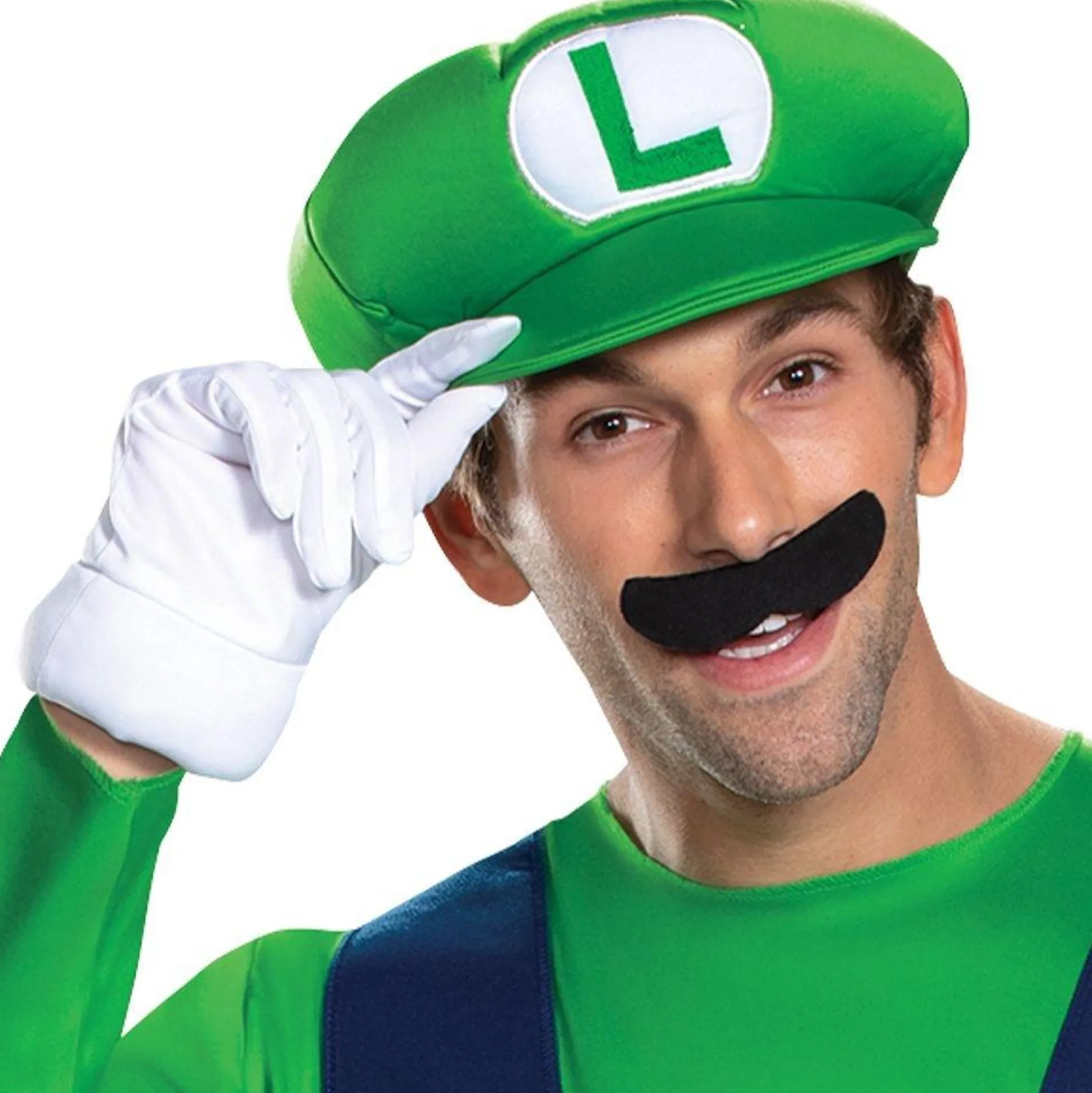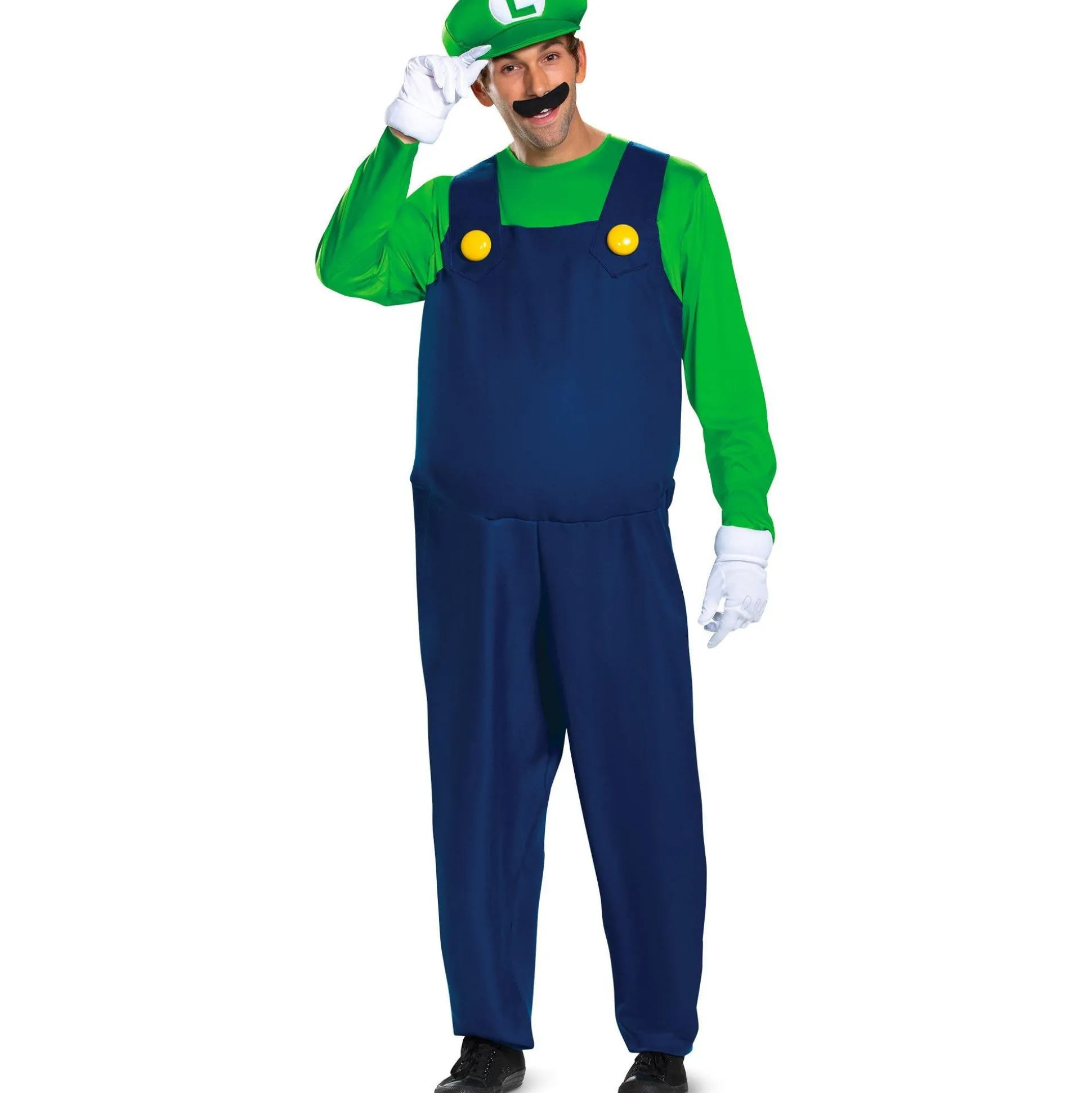 More On Adult Luigi Costume: You Can 1Up Everyone Else This Halloween In This Luigi Costume For Adults! The Costume Includes A Blue Overall Jumpsuit With Large Yellow Buttons And An Attached Green Long-Sleeve Shirt. Finish The Outfit With The Embroidered Green L Hat, White Gloves, And A Black Self-Adhesive Moustache. Bowser Will Meet His Match Once You Are Suited Up In This Luigi Costume! Review The Size Chart For Additional Information. Shoes And Socks Not Included.