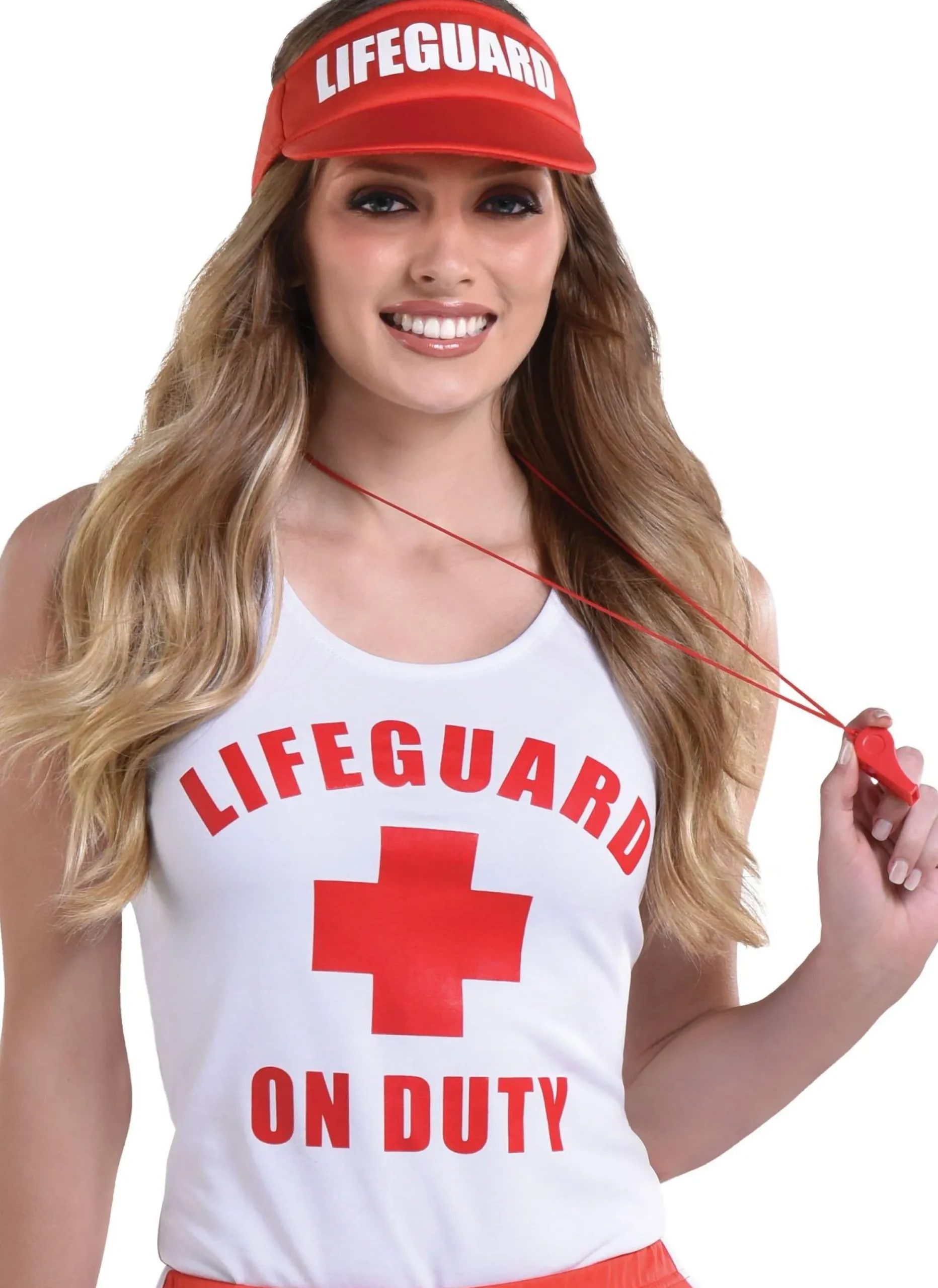 Save Drowning Kids And Look Hot Doing It As A Lifeguard Babe. This Beach-Ready Costume Includes A Lifeguard On Duty Tank Top, Red Lifeguard Drawstring Shorts, A Lifeguard Visor, A Whistle, And An Inflatable Buoy.