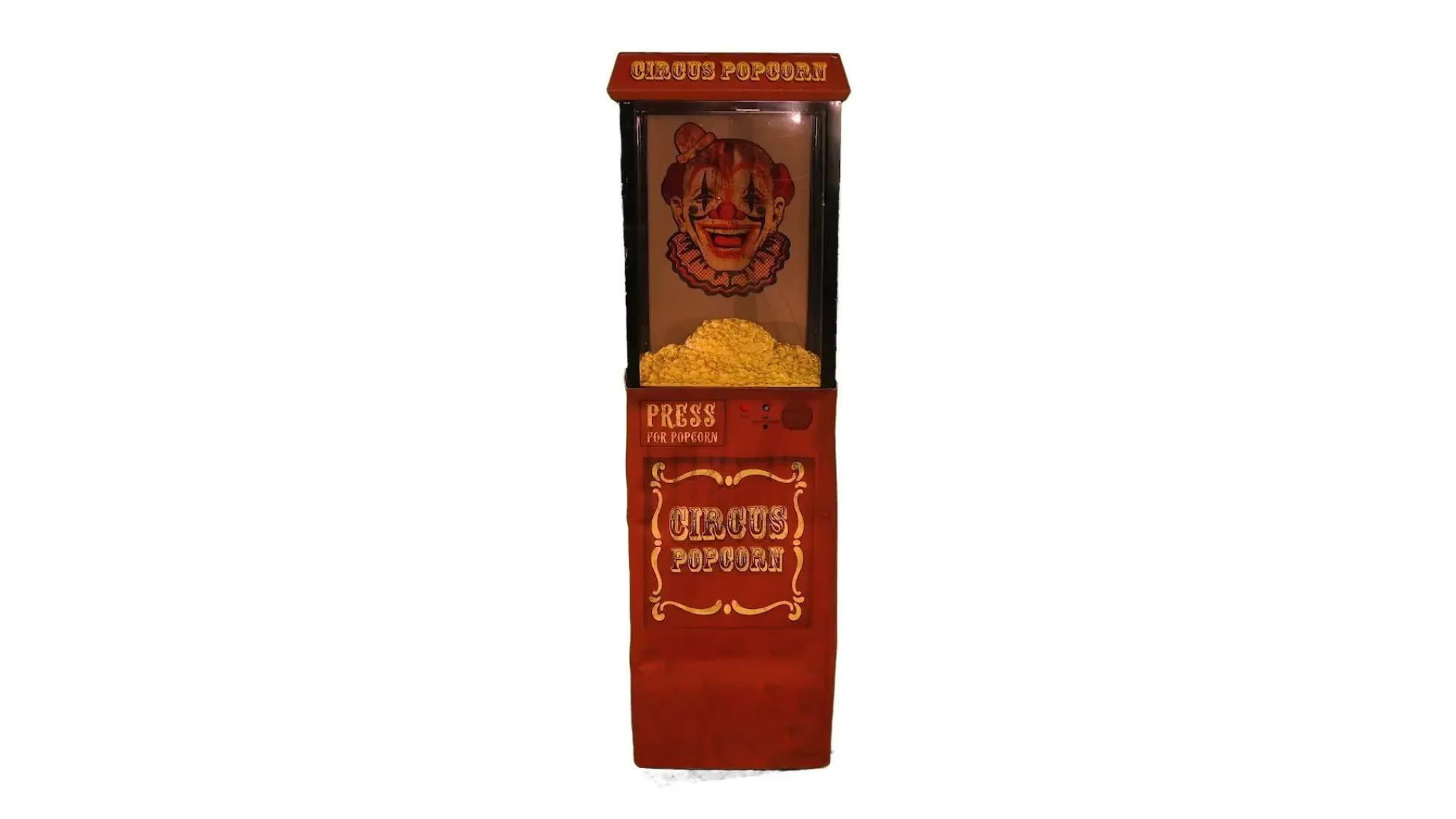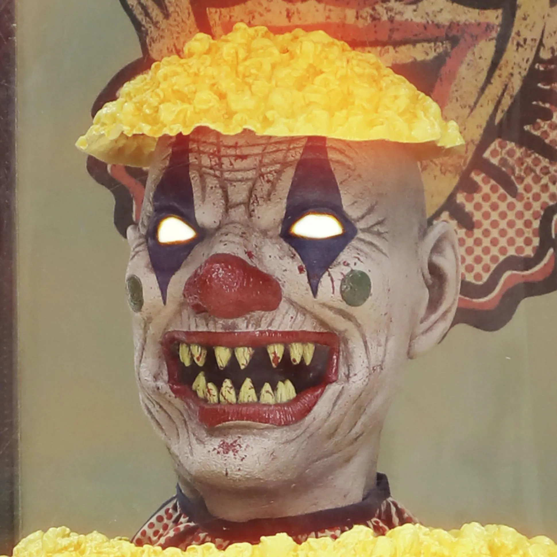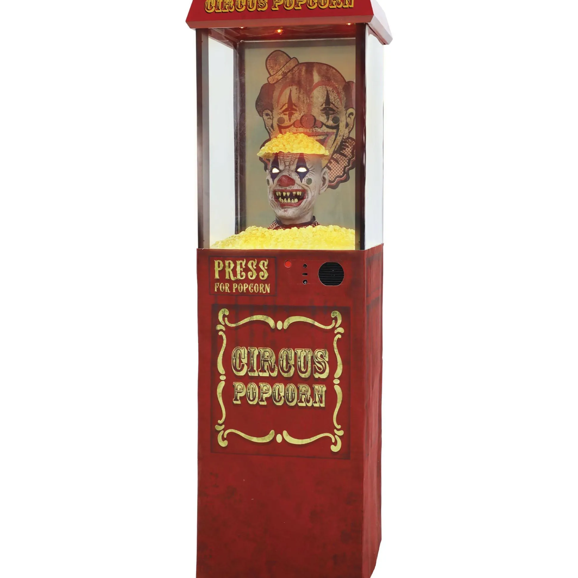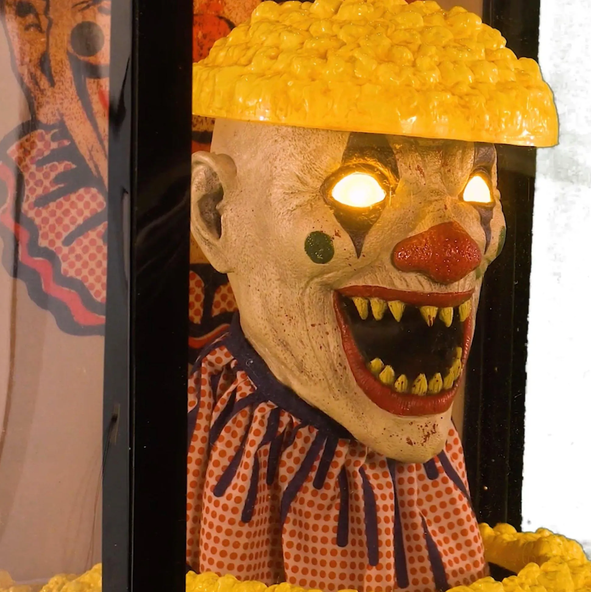 Make Halloween Visitors Jump In Fright With The Circus Popcorn Clown! This Animatronic Decoration Looks Like A Regular Circus Popcorn Machine — Until An Evil Clown Pops Out With A Frightening Roar! The Clown Returns To Preview The Circus Show (Spoiler Alert: It’s Filled With Murder). Activate The Clown Head By The Motion Sensor Or By Pushing The Button For Popcorn.