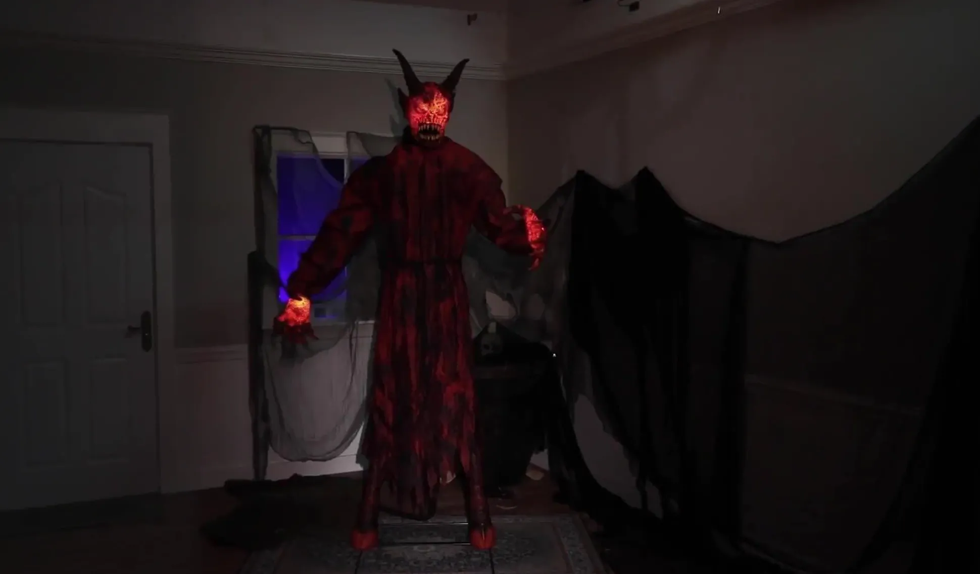 Unleash A Burning Evil This Halloween — The Lava Demon! This Animatronic Demon Features A Head And Hands Lit Like Magma, A Devil’s Tail, And Goat Hooves And Horns. When Activated, The Demon Turns Side To Side And Warns Passersby Of The Eternal Suffering That Awaits Them. Hook The Demon Up To A Fog Machine, And He Releases Fog Through His Horns.