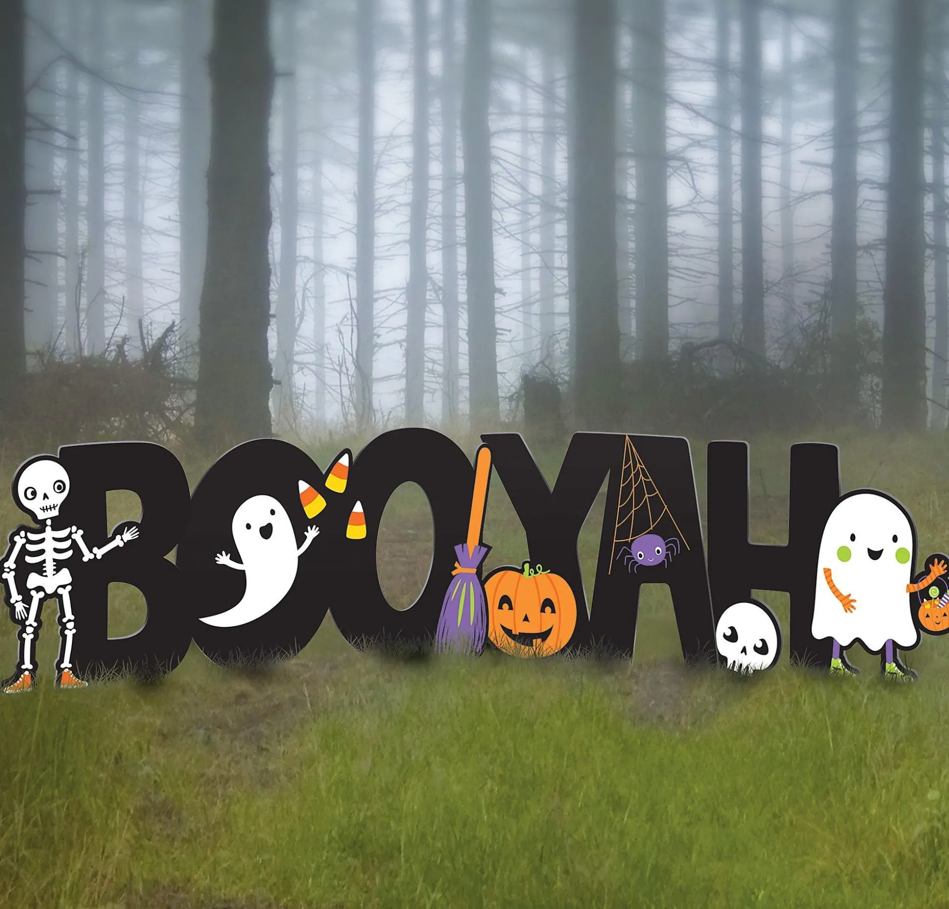 If You’Re Throwing A Kid-Friendly Halloween Party, You Can Welcome Guests With This Halloween Friends Booyah Yard Sign Set. These Halloween Yard Decorations Are Plastic Cutouts That Spell Out Booyah. Silly Skeletons And Goofy Ghosts Add An Extra Fun Look To The Sign. Stick These Signs Into Your Lawn Or Use Them As Photo Props At Your Child’s Halloween Party.