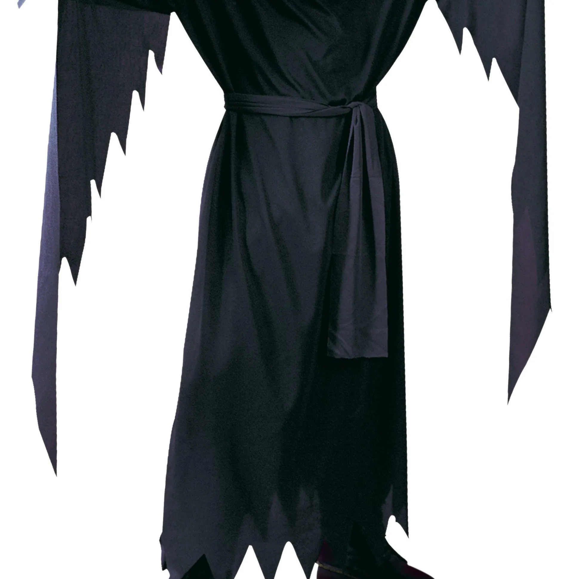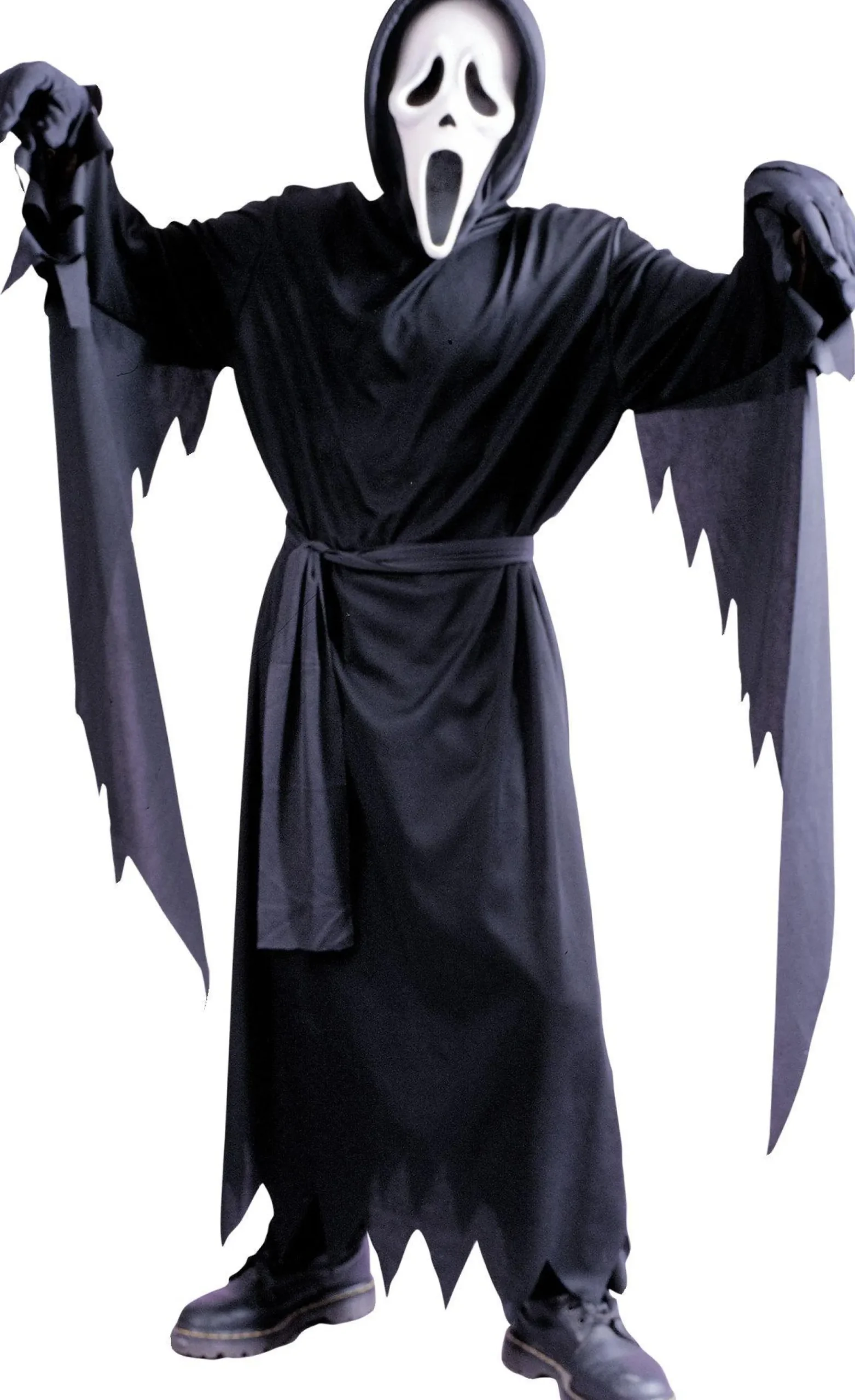 This Costume Is A Scream! This Boys Ghost Face Costume Features The Movie Slasher’s Signature Scream Mask, Long Hooded Black Robe With Sawtooth Hem And Drape Sleeves, And A Black Belt Tie.
