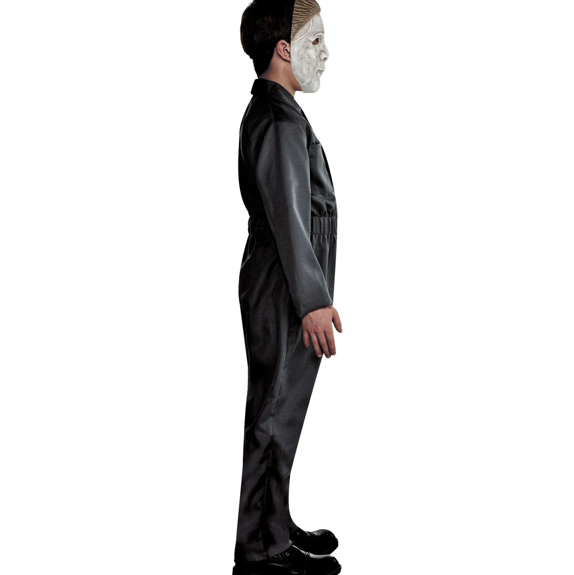 More On Halloween Child Michael Myers Costume: Your Child Will Bring The Spooky To Halloween When They Wear This Michael Myers Costume For Kids! This Costume Contains A Dark Gray Long-Sleeve Jumpsuit With A Worn-In Design. The White Face Mask Is Styled After The One Worn In The Halloween Movies, With Painted Brown Eyebrows, Molded Brown Hair, And Large Eye Cutouts For Visibility. Review The Size Chart For Additional Information. Shoes And Knife Not Included.