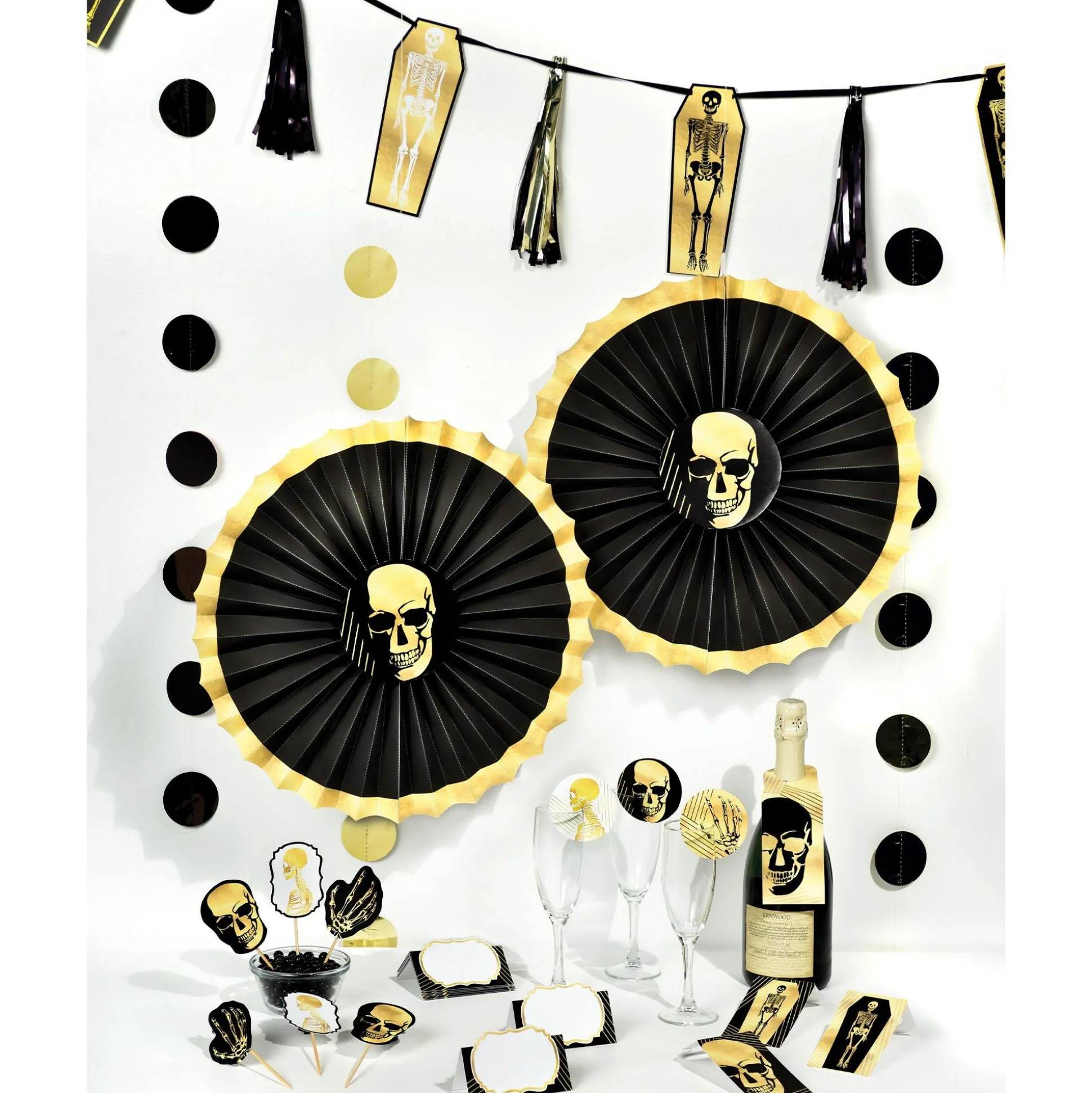 Make The Ghosts And Goblins Feel Welcome With A Halloween Bar That’s Boneyard Glam! This Decorating Kit Has A 9Ft Banner, Fans, Drink Markers, Bottle Tags, And More, And Features A Black And Metallic Gold Design With Skeletons And Their Bony Parts. Perfect For Decking Out A Bar Or Buffet, The Kit Even Includes Tent Cards So You Can Assign A Ghoulishly Good Drink Or Spooky Surprise To Each Guest.