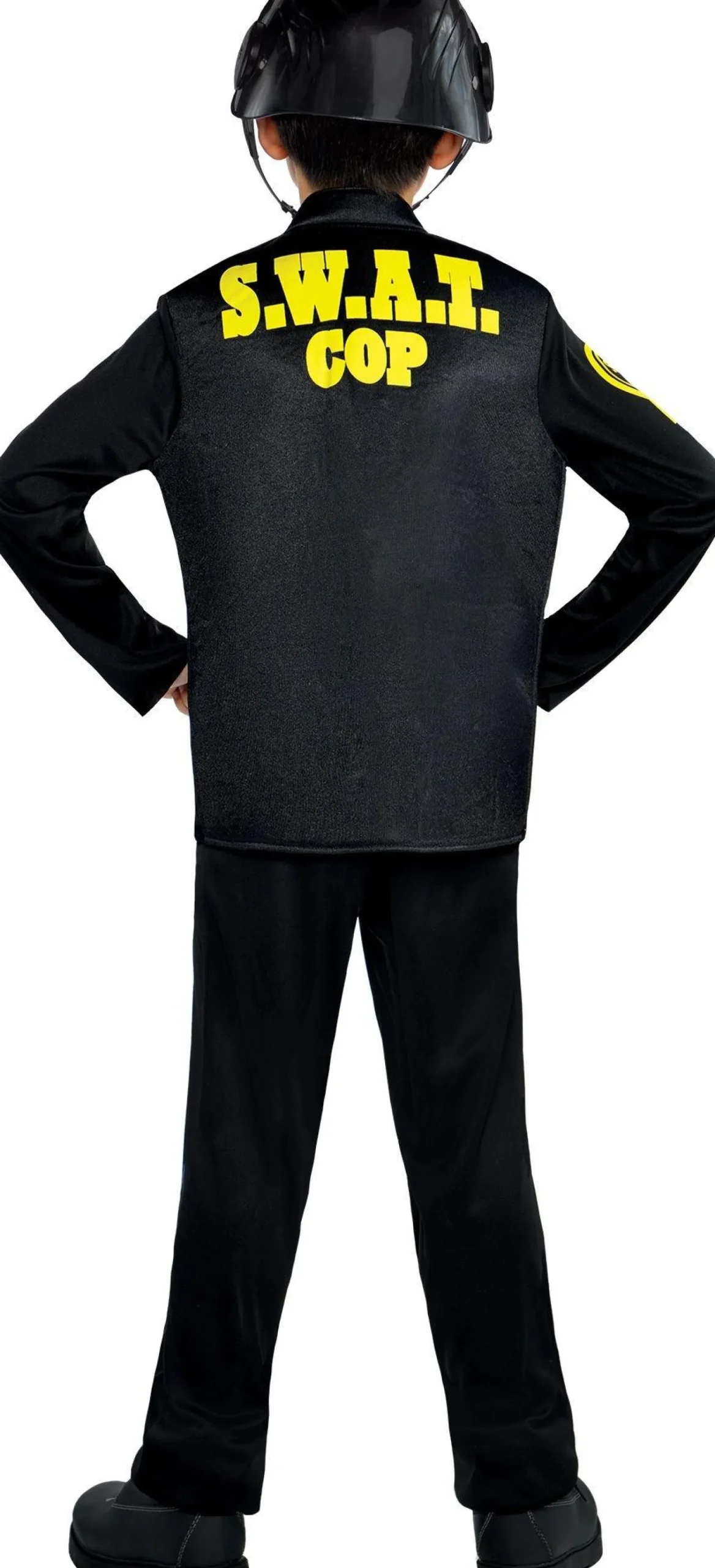 Watch Your Little One Emulate Their Real Life Heroes As A Swat Team Member! This Police Swat Costume Features A Black Jacket With S.W.A.T. Cop In Bright Yellow On The Chest And Attached Badges On The Shoulder And Sleeve. The Jacket Has Loops And Hooks So You Can Attach The Flashlight, Whistle, Toy Walkie-Talkie And Binoculars To The Uniform. Pull On The Black Hard Helmet With The Attached Visor And Their Swat Cop Costume Is Ready For The Mission!
