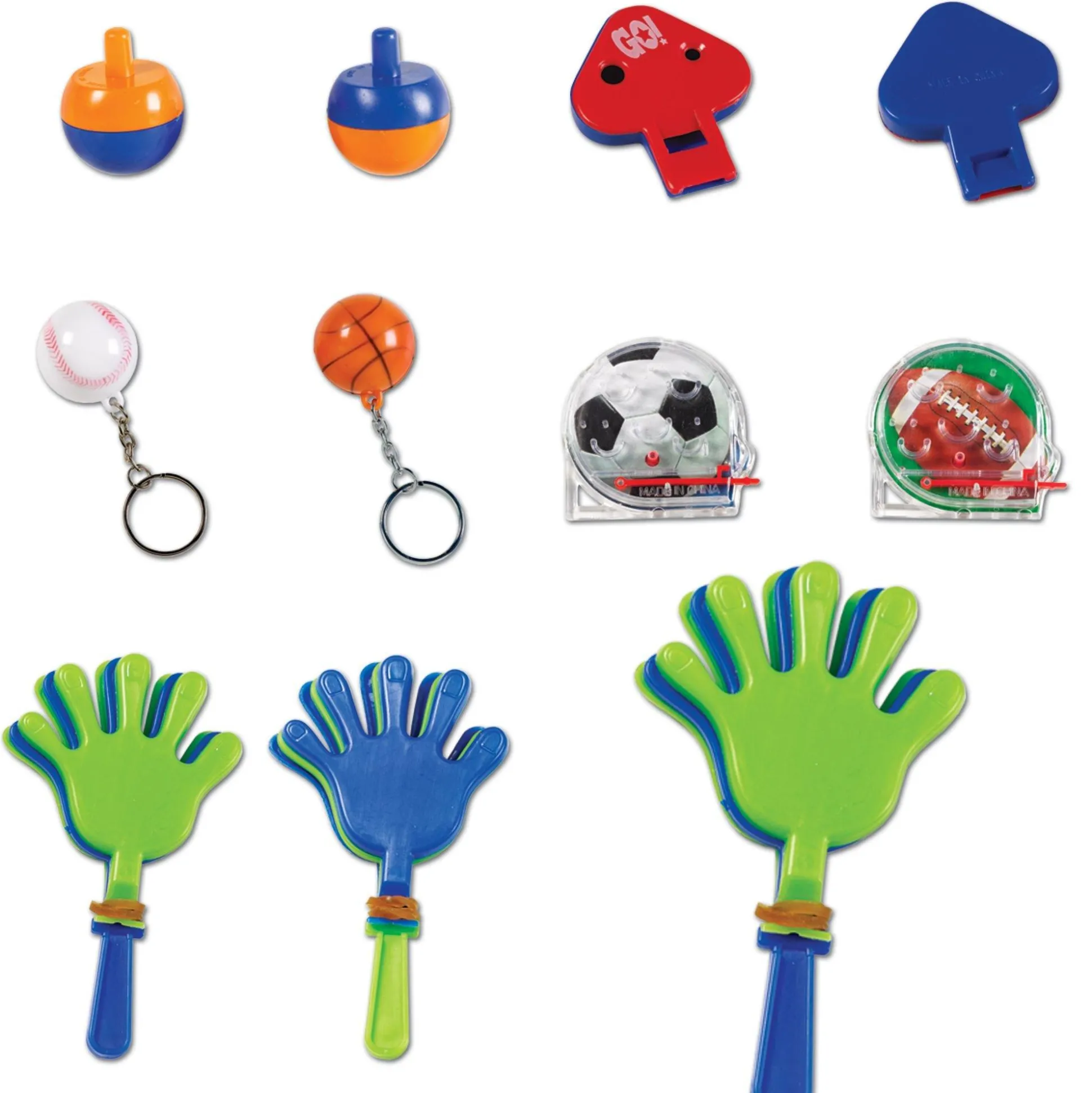 Show You Know The Score With Play Ball Sports Party Favors! This Super Pack Of Party Favors Features Your Favorite Sports In Five Different Varieties Of Classic Party Favors, Including Tops, Hand Clappers, Keychains, Pinball Games, And Whistles. With A Total Of 100 Party Favors, None Of Your Little Fans Will Be Leaving Your Sports Party Empty Handed.