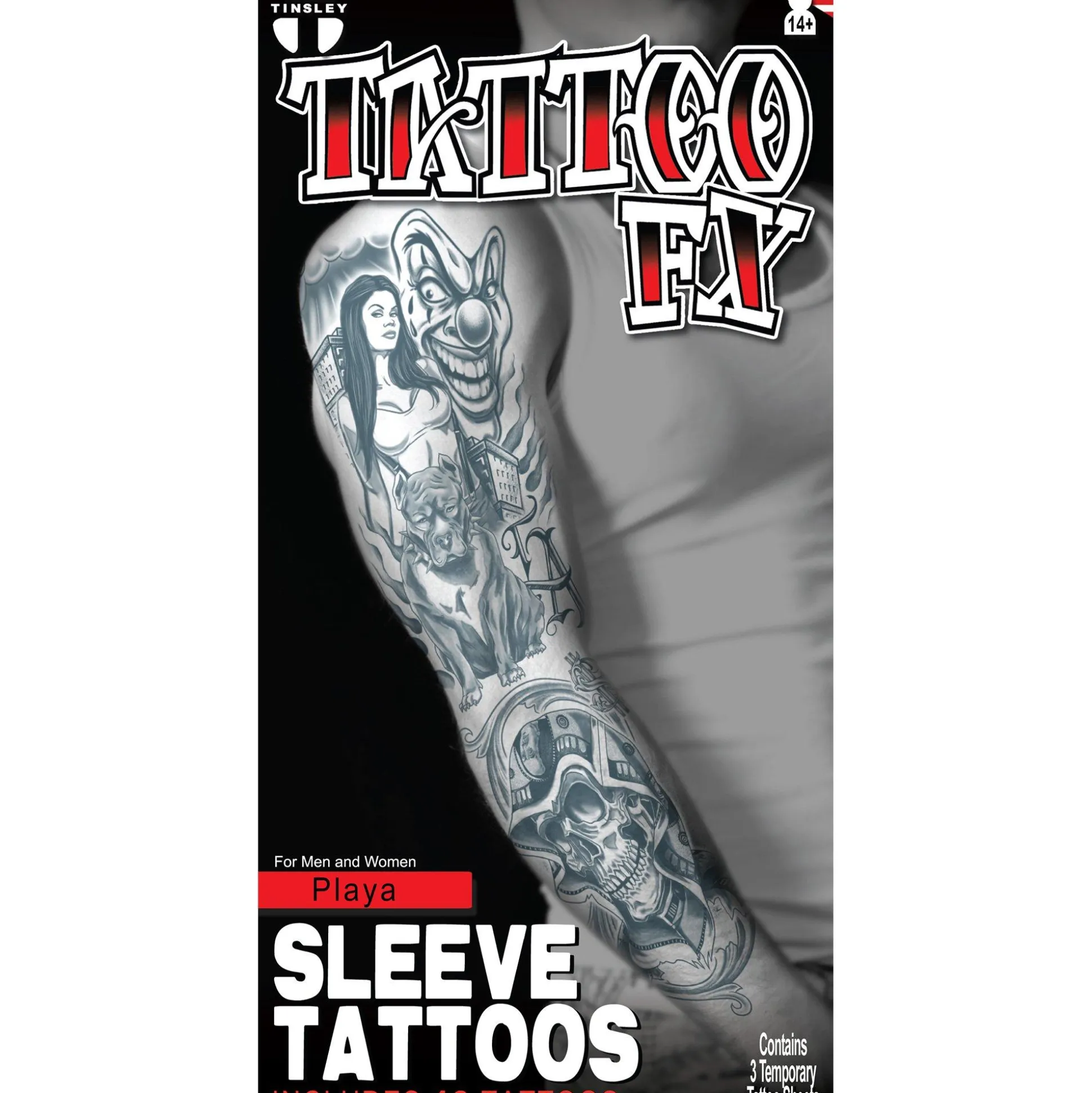 Give Your Costume Edgy Appeal With Playa Tattoos! These Black And White Temporary Tattoos Form A Whole Arm Sleeve And Feature A Money Reaper, A Pit Bull, And Other Urban-Inspired Designs.