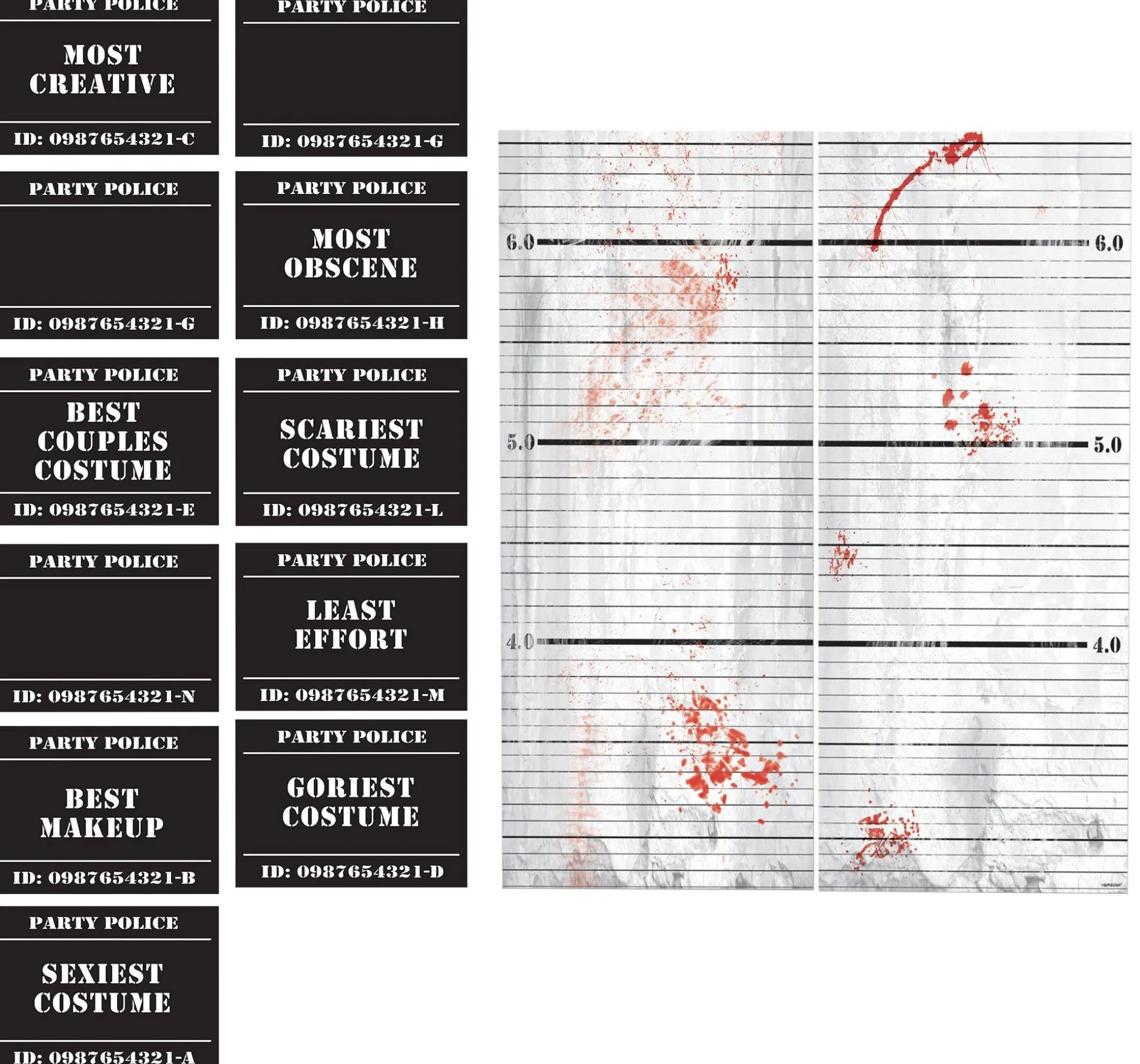 Everyone Will Be Ready To Snap Their Mugshot At The Costume Party With A Police Lineup Scene Setter With Photo Booth Props! Decorate Your Walls With The Two Posters Designed To Look Like A Bloody Police Lineup Backdrop When Put Together. Next, Have Your Guests Choose An Id Sign Featuring Different Nominations Such As Best Makeup, Funniest Costume, And More. Snap A Picture Of Your Guests Holding Up The Sign In Front Of The Backdrop. It Would Be A Crime To Not Take A Picture With This Scene Setter And Photo Booth Props!