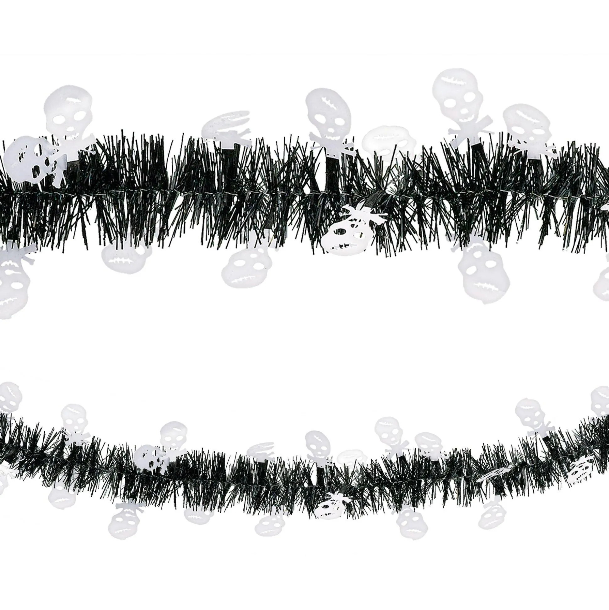 Complete Your Halloween Mantle With A Spooky Tinsel Garland. This Nine-Foot Garland Features White Skulls And Long Black Tinsel.