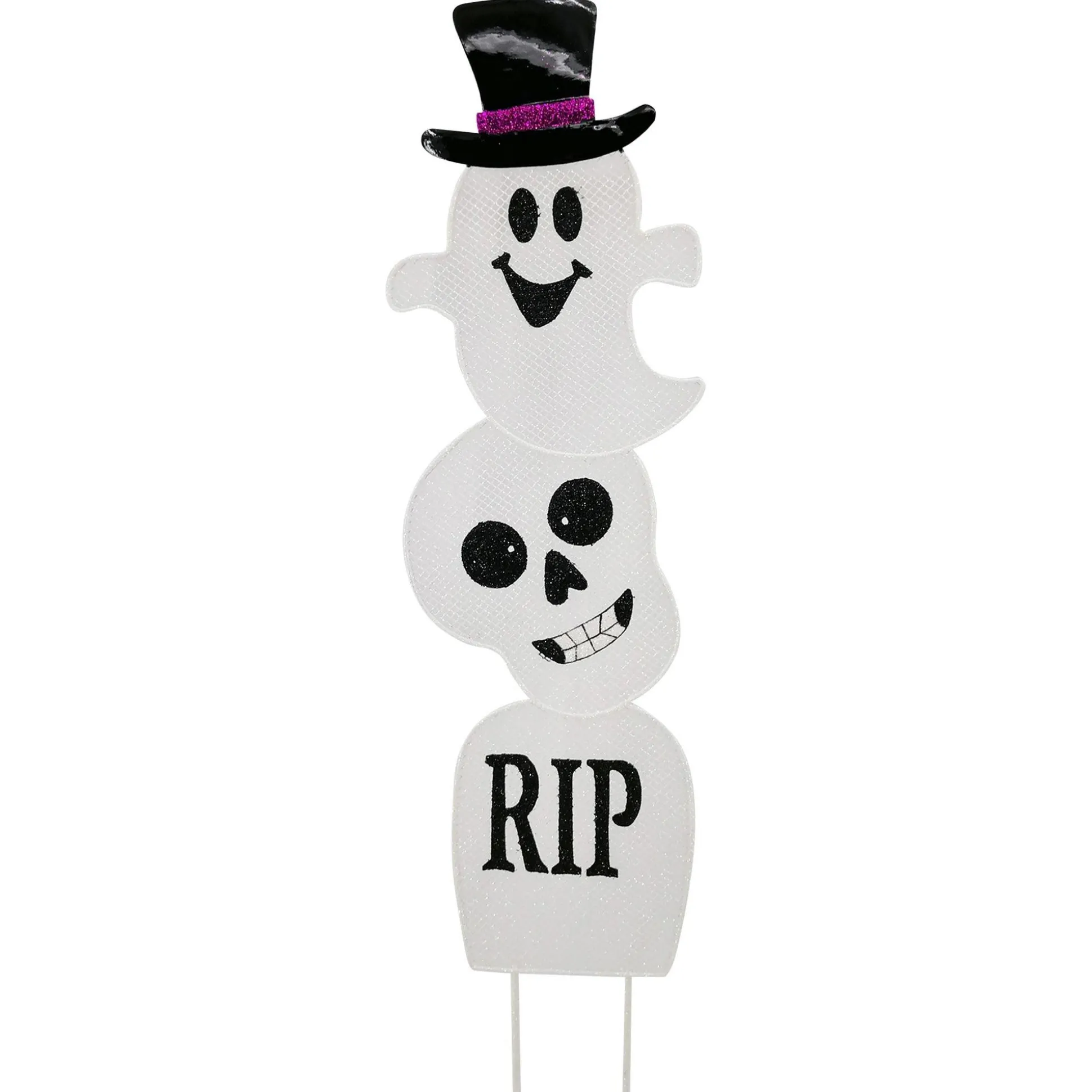 Catch The Eye Of All The Trick-Or-Treaters With A Stacked Ghost Yard Sign. This Festive Halloween Decoration Features Three Smiling Ghosts Stacked On Top Of Each Other. The Ghosts Are Made Of Glitter White Metal Mesh, With The Top Ghost Wearing A Black Top Hat. Attached Metal Stakes Make It Easy To Put This Halloween Decoration Anywhere On Your Yard.