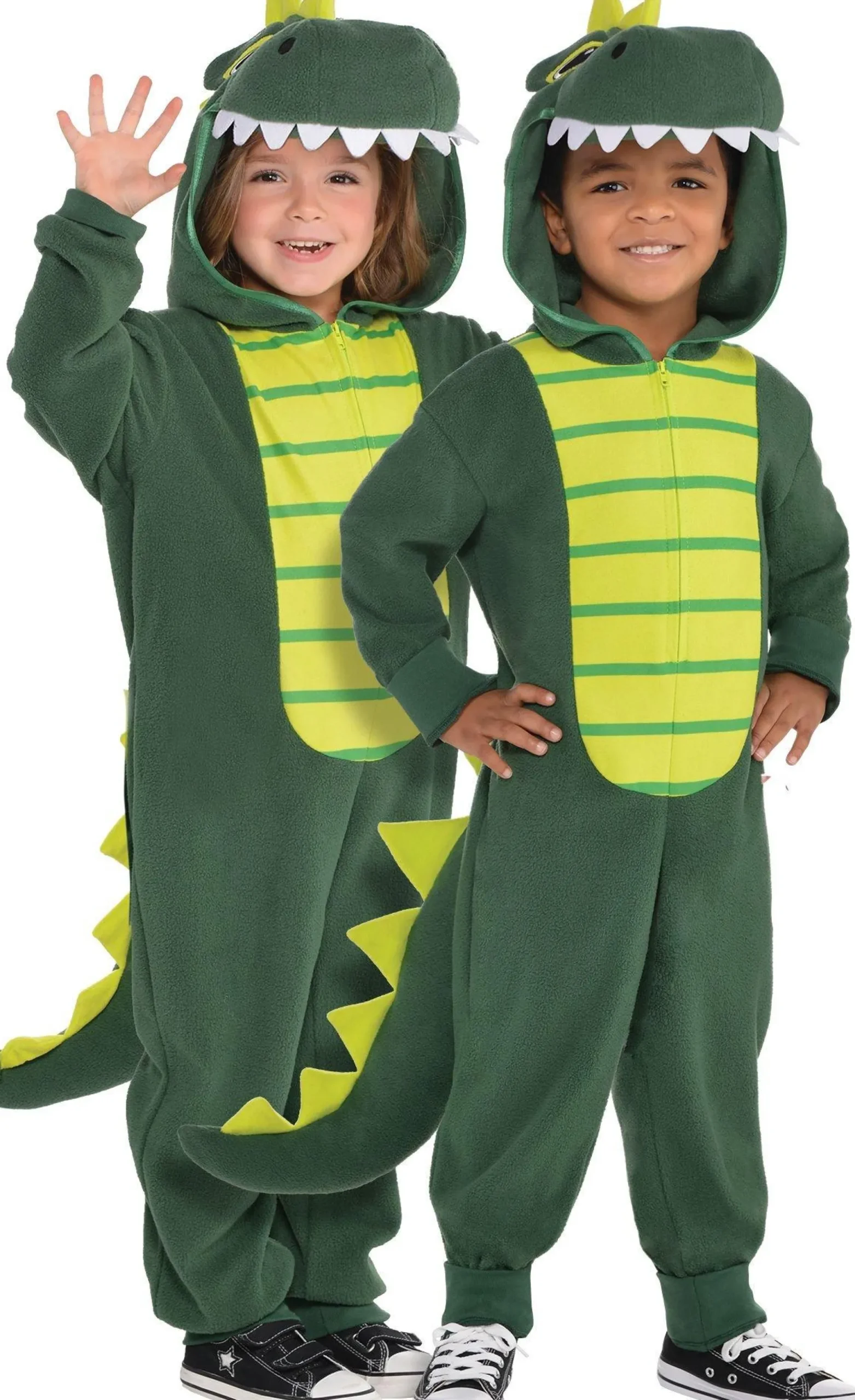 More On Toddler Zipster Dinosaur One Piece Costume: Dino-Mite! This One-Piece Dinosaur Jumpsuit For Toddlers Makes A Quick And Easy Costume. Made Of Comfortable Fleece, The Warm Hooded Jumpsuit Features Stretch Wrist And Ankle Cuffs, A Stuffed Tail, And Spikes Down The Back. The Attached Hoodie Has Spikes On Top With Dino Teeth Around The Top Of The Hood Across Their Forehead. A Front Zipper Means He Can Jump Into This Dinosaur Jumpsuit Costume Easily! Shoes Not Included.