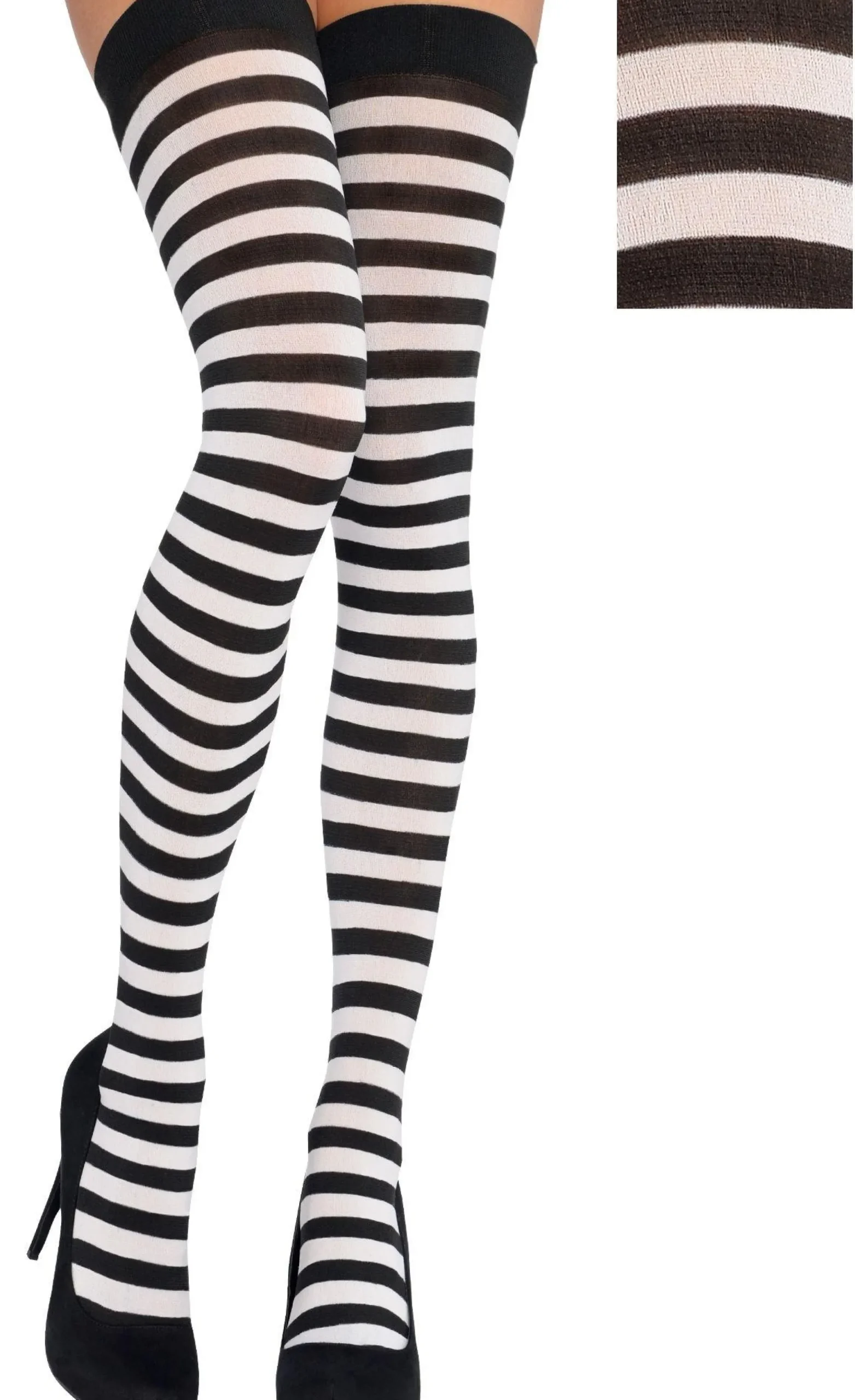 Show Your Stripes With Adult Black And White Striped Thigh-High Stockings! These Stretchy Nylon Thigh-High Stockings Feature Black And White Stripes With An Elastic Cuff To Hold Them In Place. Great With Green Skin And Buckled Shoes, These Thigh Highs Bring Out Your Witching Powers — Just Beware Of Water! One Size Adult Black And White Striped Thigh-High Stockings Fit Most Standard Women’s Sizes (5’2-5’9 And 90-160 Lb).