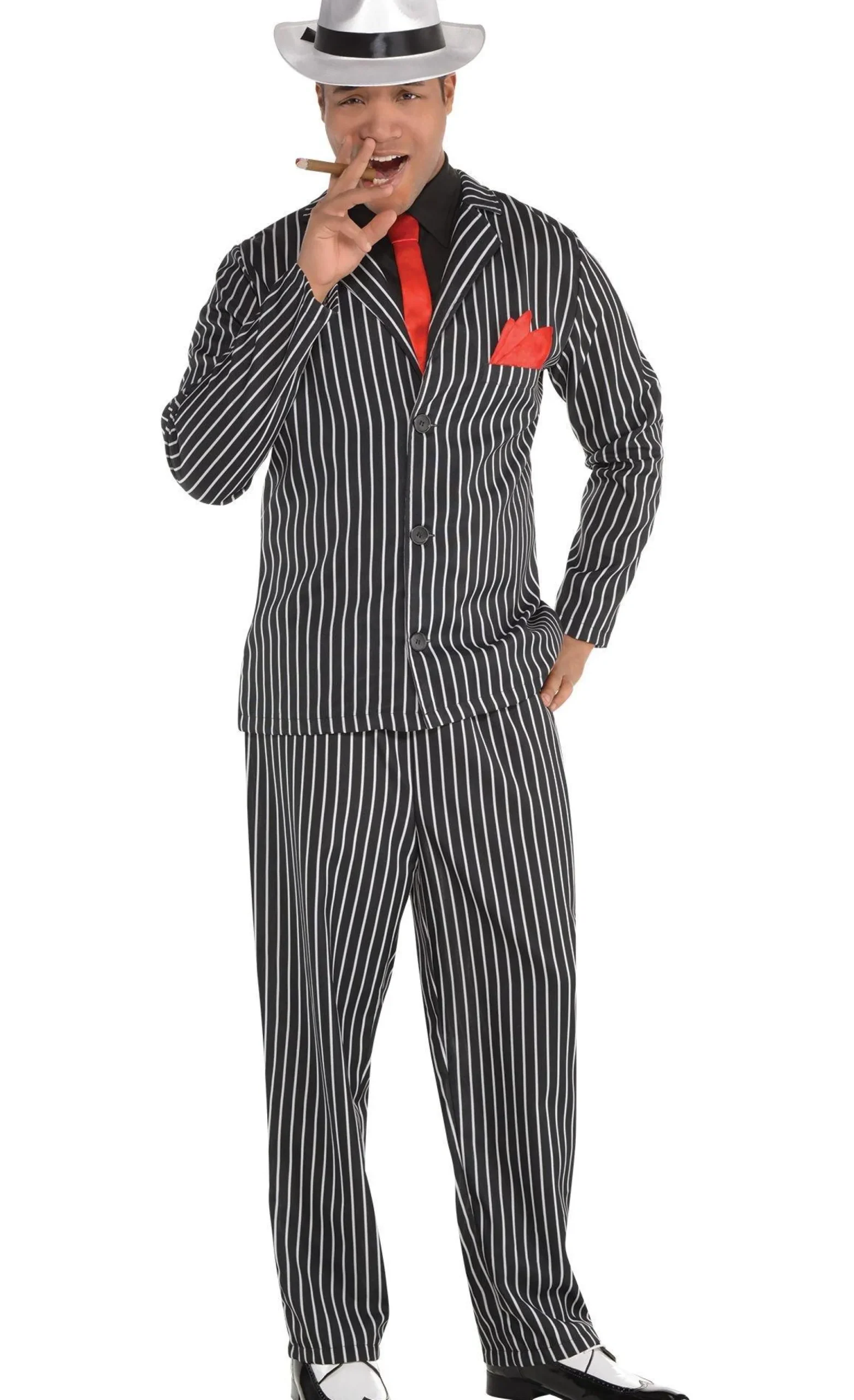 The Perfect Costume For Those New Concrete Shoes You Just Bought! Our Adult Mob Boss Costume Features A Thick Pinstriped Poly-Knit Mobster Jacket And Pants With A Comfortable Elastic Waistband. An Attached Black Mock Gangster Shirt Is Included And A Mock Tie And Matching Handkerchief Give You That Signature Mob Boss Look Without Having To Go On The Lam.