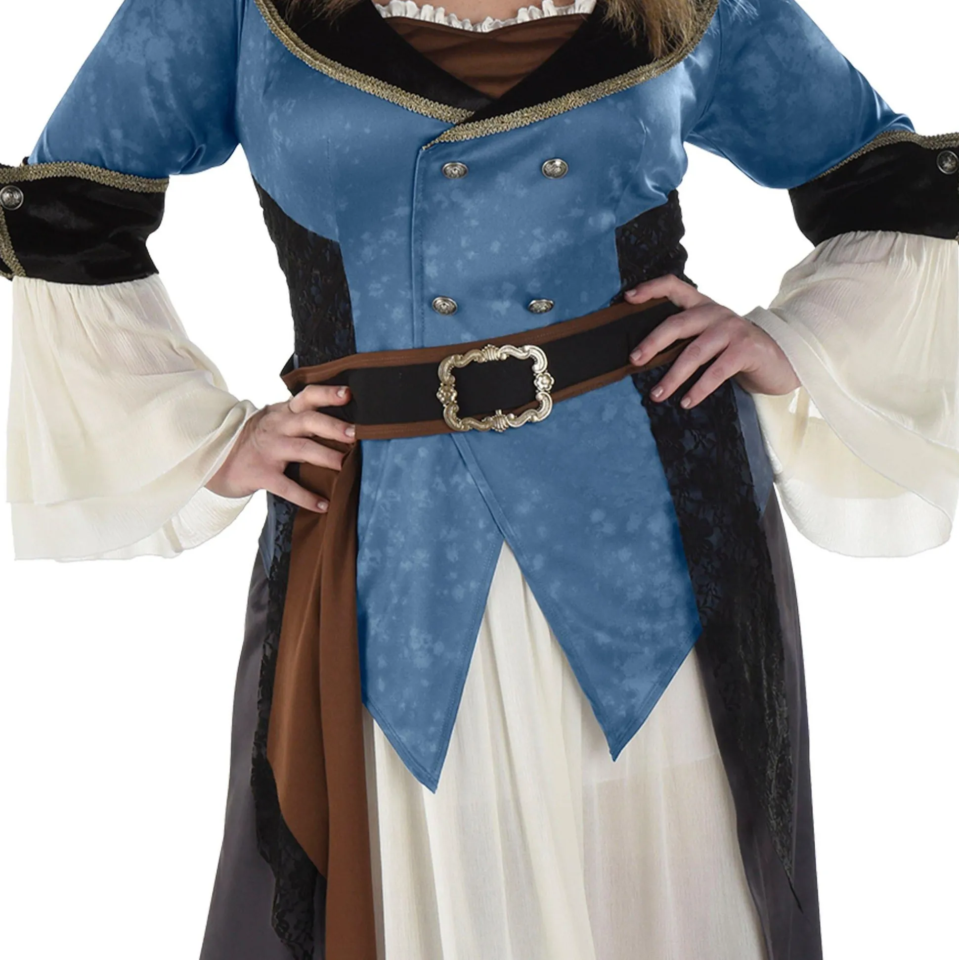 Make The Other Swashbucklers Jealous As The Posh Pirate! A More Elegant Pirate Style, This Costume Features A Peplum-Style Dress With An Attached Blue Suede Jacket And A Black Faux Belt With An Antique-Looking Brass Buckle. Completing The Costume Are A Black Velour Choker And A Black Suede Bicorn Hat With A Gold Skull-And-Crossbones.
